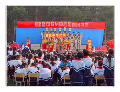 10月27日,期盼已久的艺术节汇演终于到来了!经历了一个多月的筹备,整台节目热情高,质量好,从中可见班主任的精心策划、大量付出,音乐教师的悉心指导,更是同学们的热情投入;还可见当下许多家长对孩子艺术修养的重视、培养。校合唱队以一首《红旗颂》拉开汇演的序幕,听合唱队的美妙歌声是享受。六年级的孩子们天真可爱,充分展示了童真的美好,他们的服饰绚丽、歌声清脆、舞姿活泼,每个节目的质量都很高,赢得了全场师生的阵阵掌声。七年级的同学则要成熟一些,他们的节目形式丰富多样,最值得一提的是,今年是纪念中国人民抗日战争胜利70周年,一曲《保卫黄河》赢得了全场最热烈的掌声。他们群情激昂,歌声高亢,红旗在台上飞舞,一群年少的学生能把一首革命传统歌曲唱得这样有激情,值得点赞!八年级的节目都很精彩,很具美感,让人印象深刻。最炫的是一群穿着红彤彤的民族服饰的男生,随着质朴的旋律,以十分的投入舞出了《中华好儿孙》的精气神。九年级尽管学习很紧张,但也积极参加汇演,各班派代表排演了一曲《栀子花》,毕竟是九年级了,他们以悠扬的歌声,演绎了青春的美好;而一群六年级小同学上台为大哥哥大姐姐们献花的温馨场面,为本次文艺汇演画上了句号。