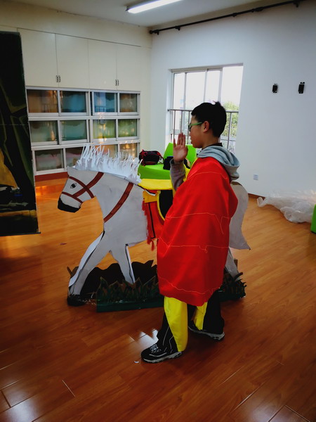 今年我们参赛队选择了长期题中的《古典……演绎经典的伪纪录片》展开解题。十月中旬我们队伍组建起来后,利用每天的午休时间以及周二周四的体活课,我们开始了紧张有序的赛题准备活动。队员们围绕着经典书目的选择以及剧情的展开展开头脑风暴,各抒己见,最终确定了剧本。之后围绕着剧情开始制作服装、道具。为了能够废物利用,节约成本,队员们用了旧纸箱、旧报纸等材料,将这些废旧物品制作成了精美的道具。队员中有的同学美术功底扎实,就负责美工方面的工作,有的同学动手能力较强,就负责技术性的工作。在长期题的准备过程中,他们有成功的喜悦,也经历了困难和挫折。相信他们一定收获颇丰!