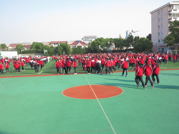 随着急促的哨音和广播中要求撤离的呼喊,师生们立即快步奔走出教室和办公室。霎时楼道内、走廊上、校园的道路上挤满了人,但是在预案充分的情况下显得忙而不乱,快而不挤:当堂课的任课教师引导学生从不同楼道撤向集合点;根据预案要求部分教师站在每个层面的楼道口组织学生有序撤离,防止踩踏事故;操场上及时进行人员的清点,保证每个人都安全地撤离险地。仅耗时2分41秒就完成了全校师生的撤离和清点,活动圆满成功。